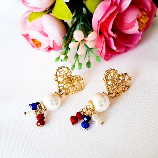 Aros Con Base en Forma de Corazón Tejida en Alambre Y Perla Colgante