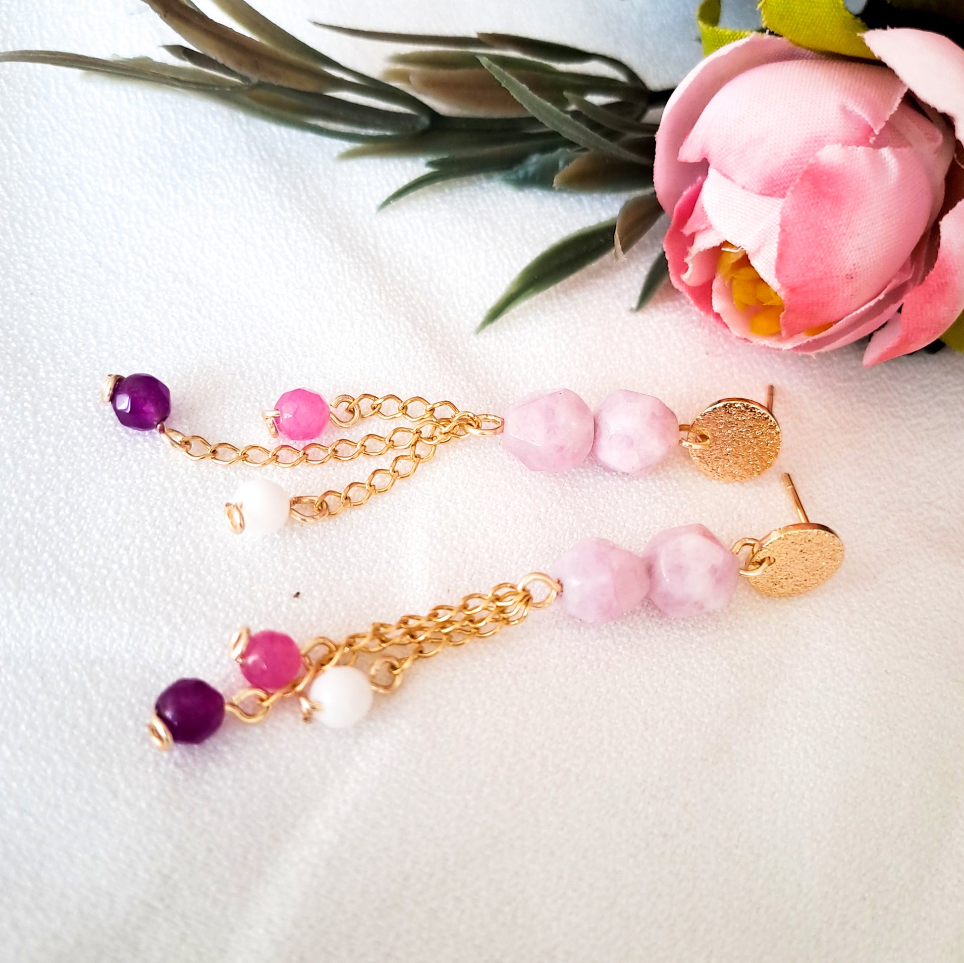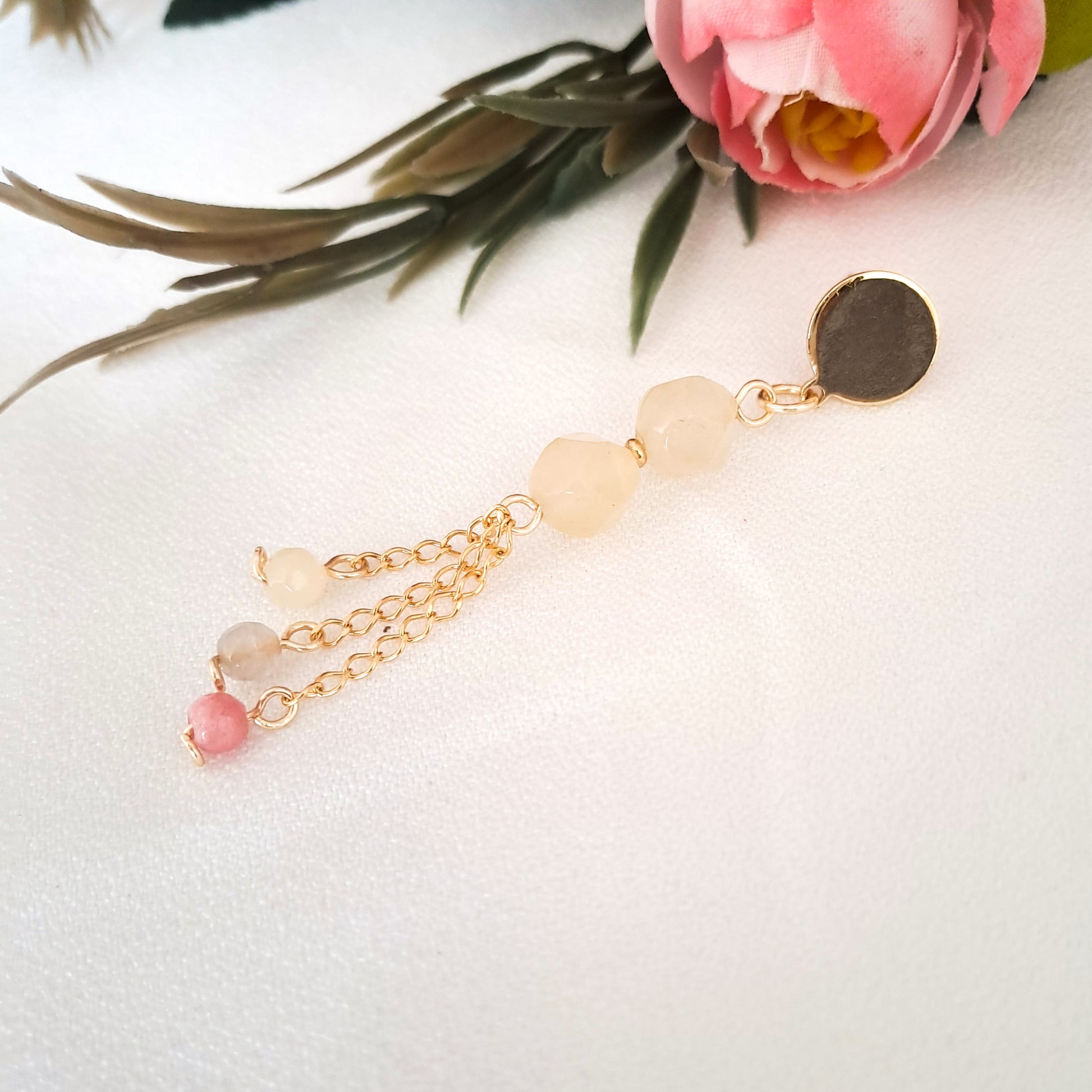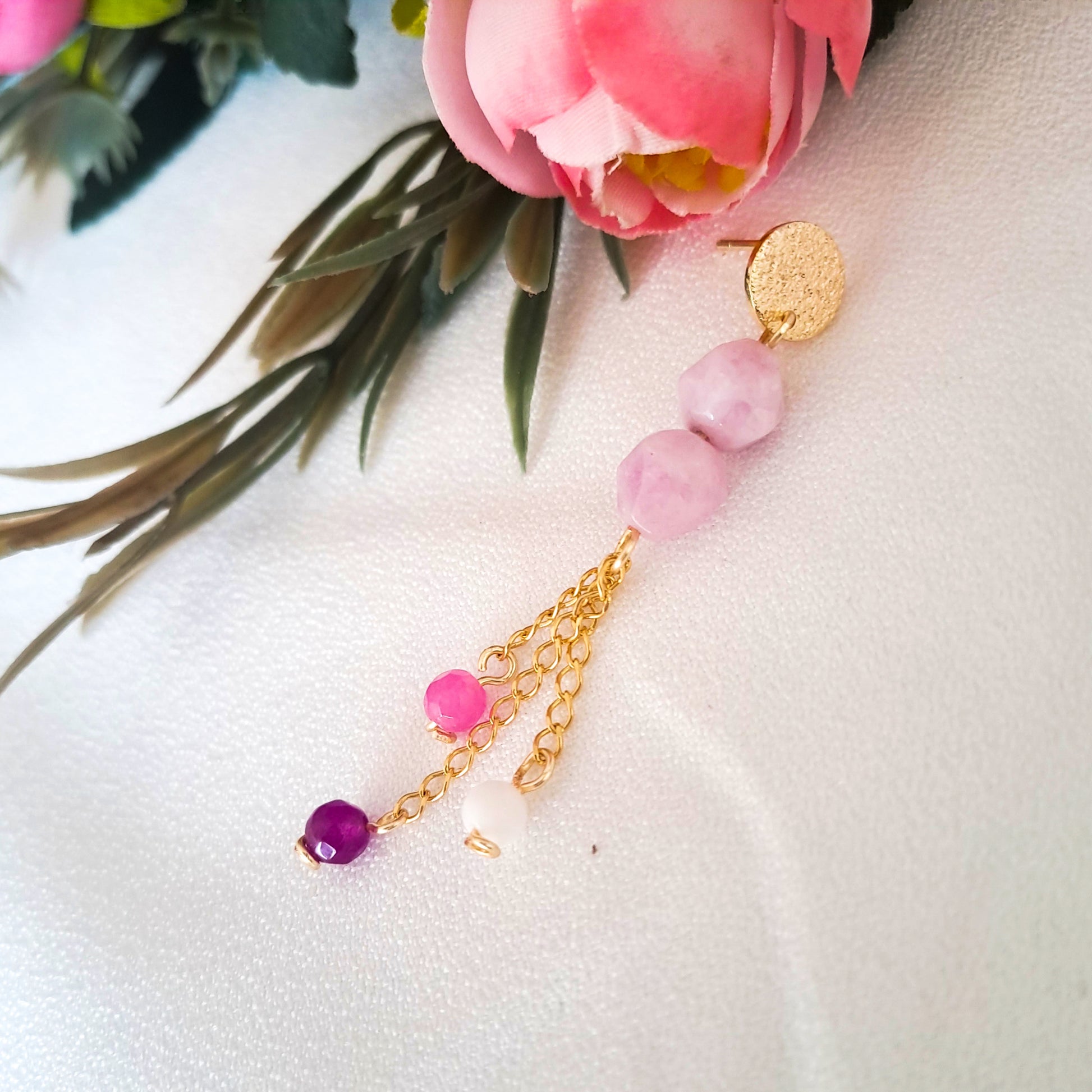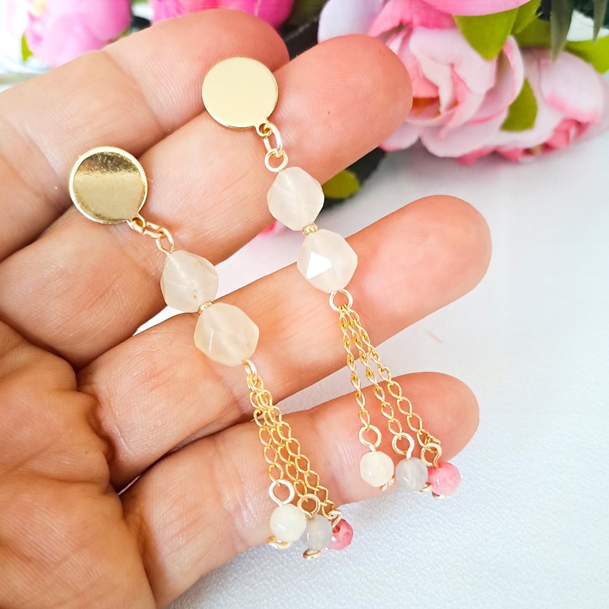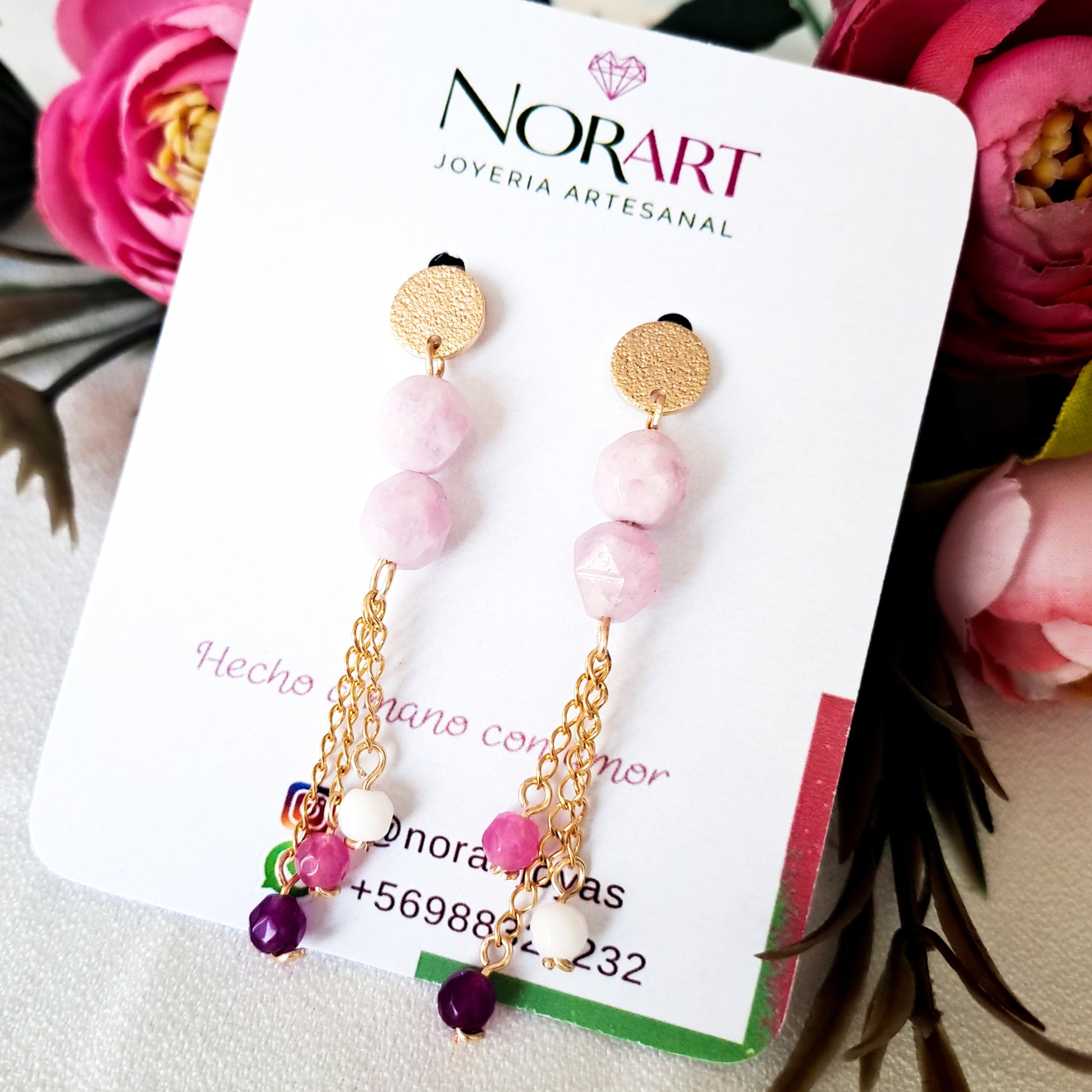 Cada par viene con dos piedras ágatas de 8 milímetros, engarzadas con arte en alambre y acompañadas por tres cadenitas de distintos tamaños, que terminan en una piedra ágata de 4 milímetros.