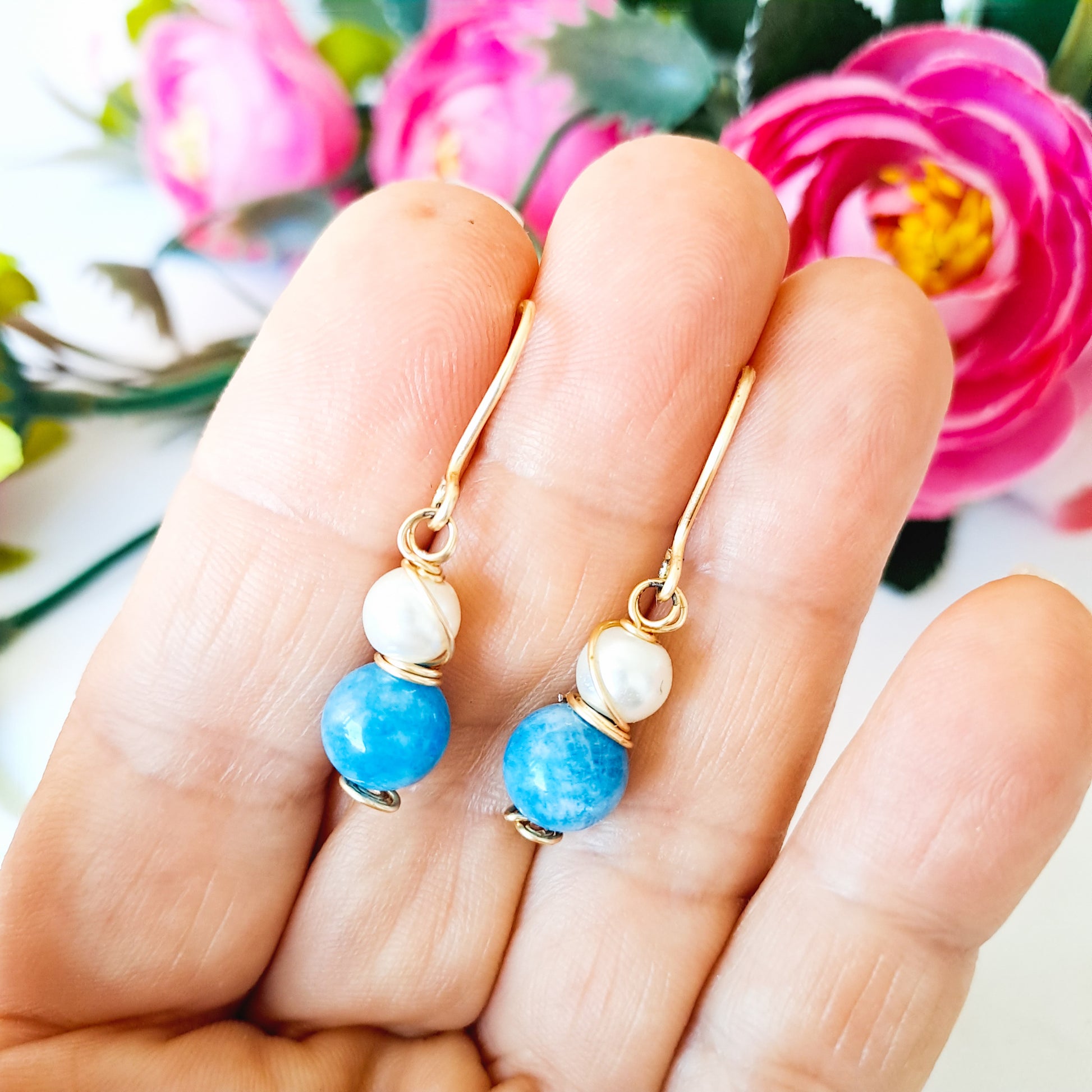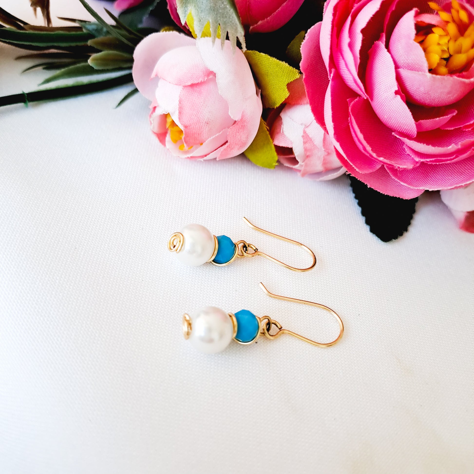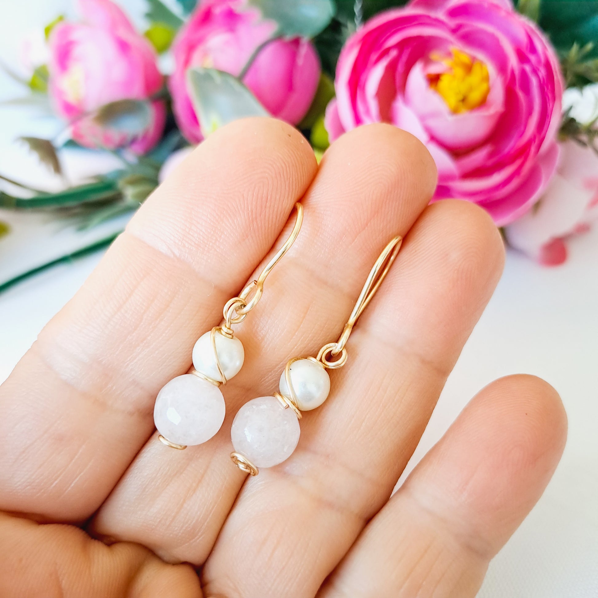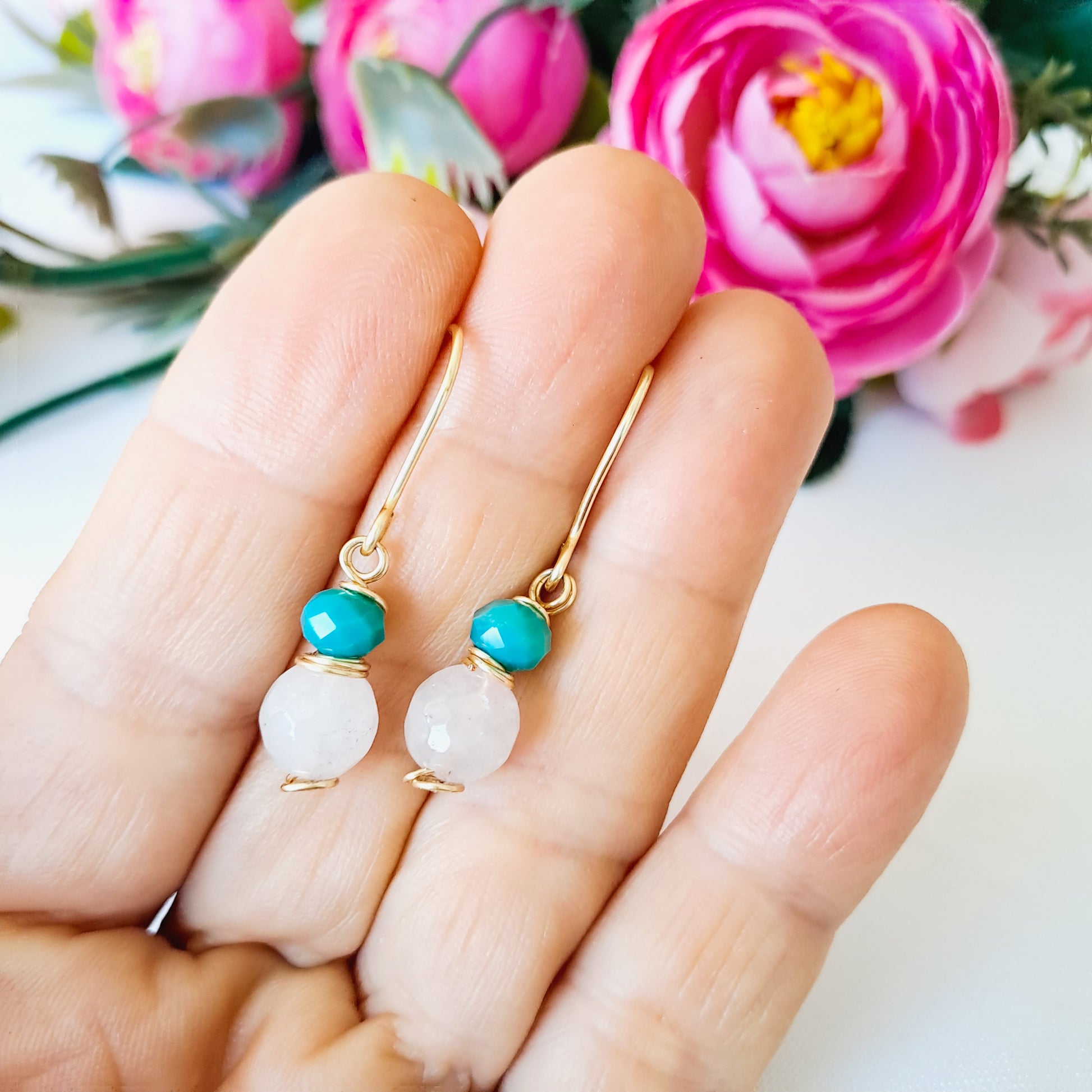 Cada aro lleva una piedra (o perla) de 8 milímetros y un cristal (o perla) de 6 milímetros, ambas engarzadas juntitas y colgando de un pequeño anzuelo.
