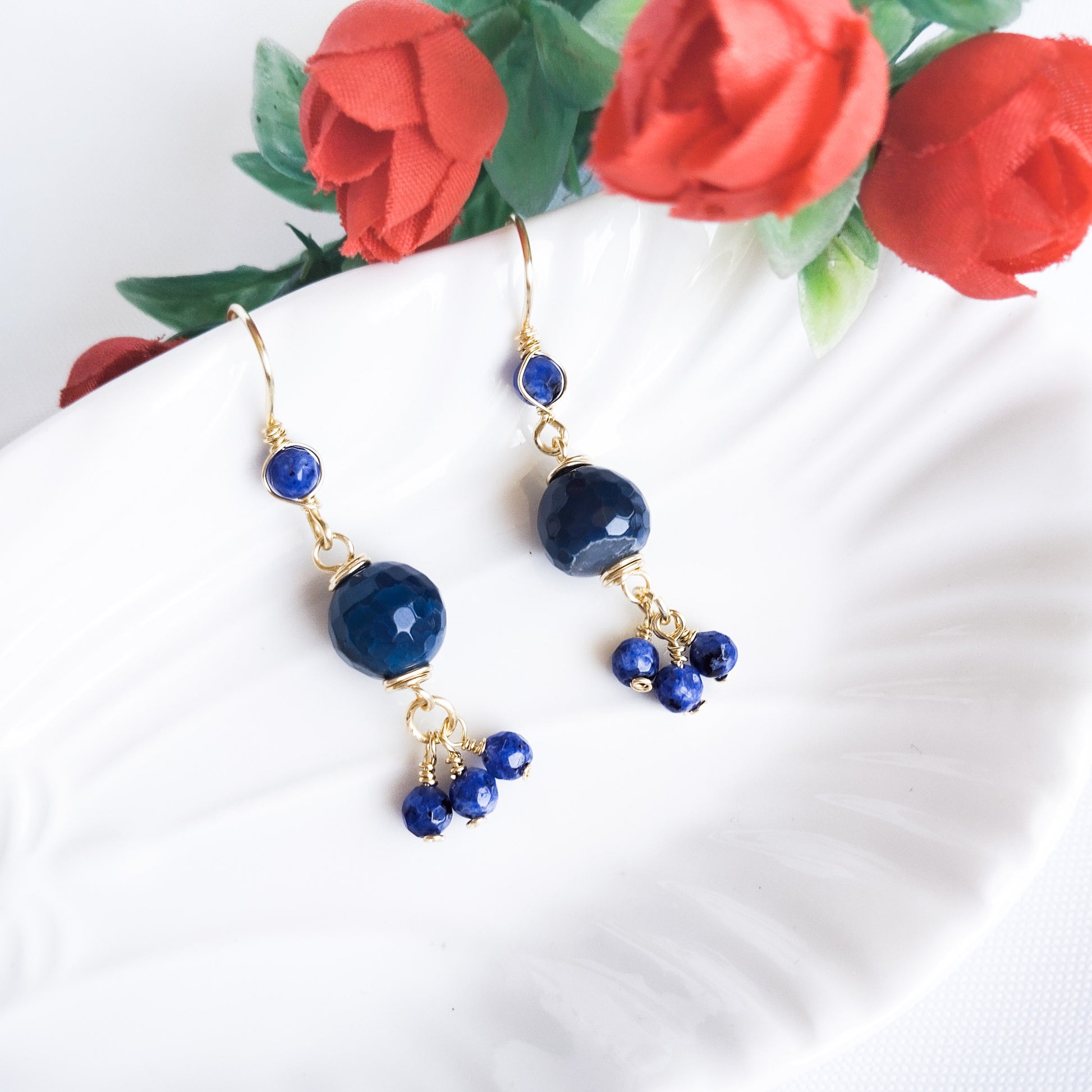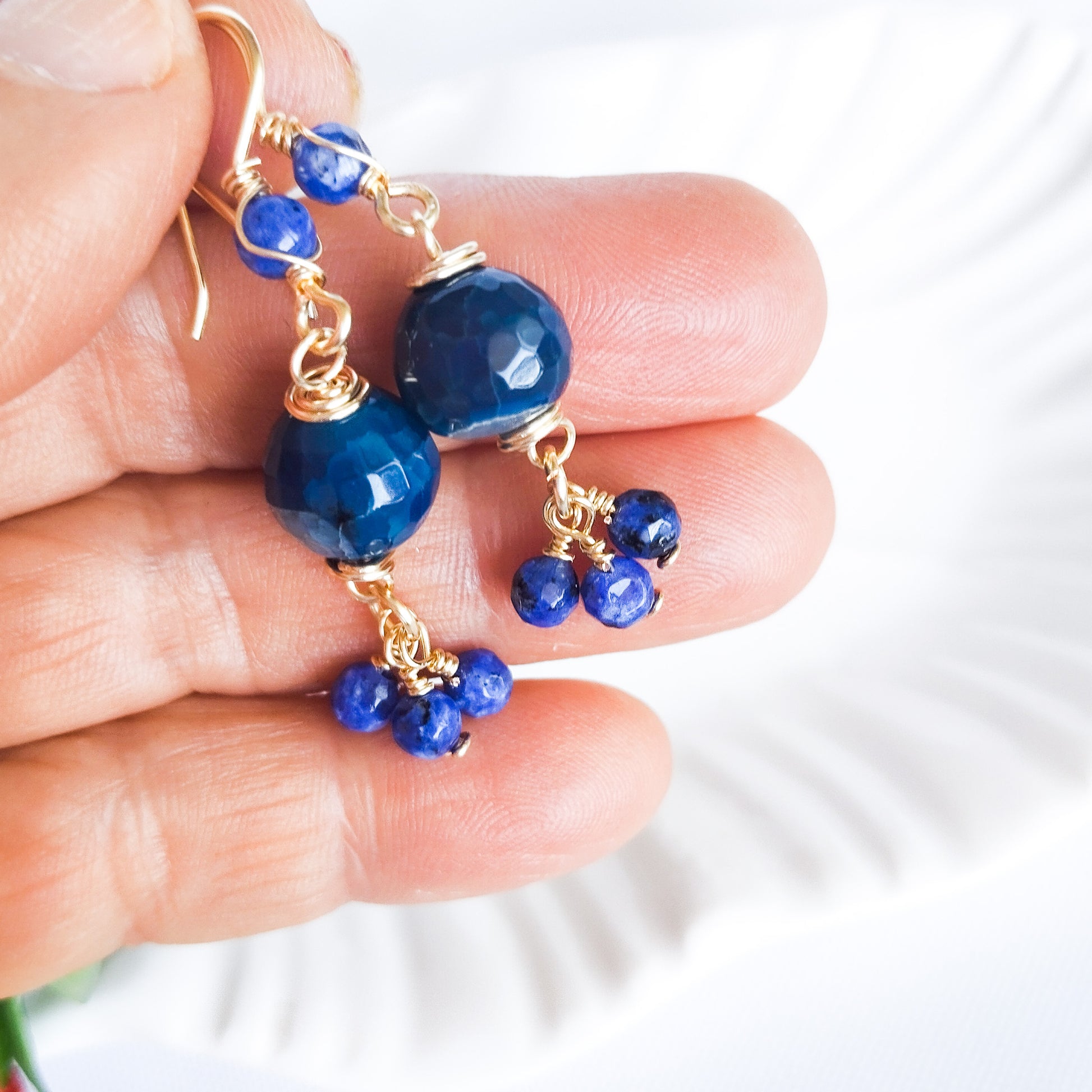 Aros colgantes con una ágata número 10 y 3 ágatas número 4 colgando de la piedra principal. Anzuelo en baño de oro decorado con una ágata.