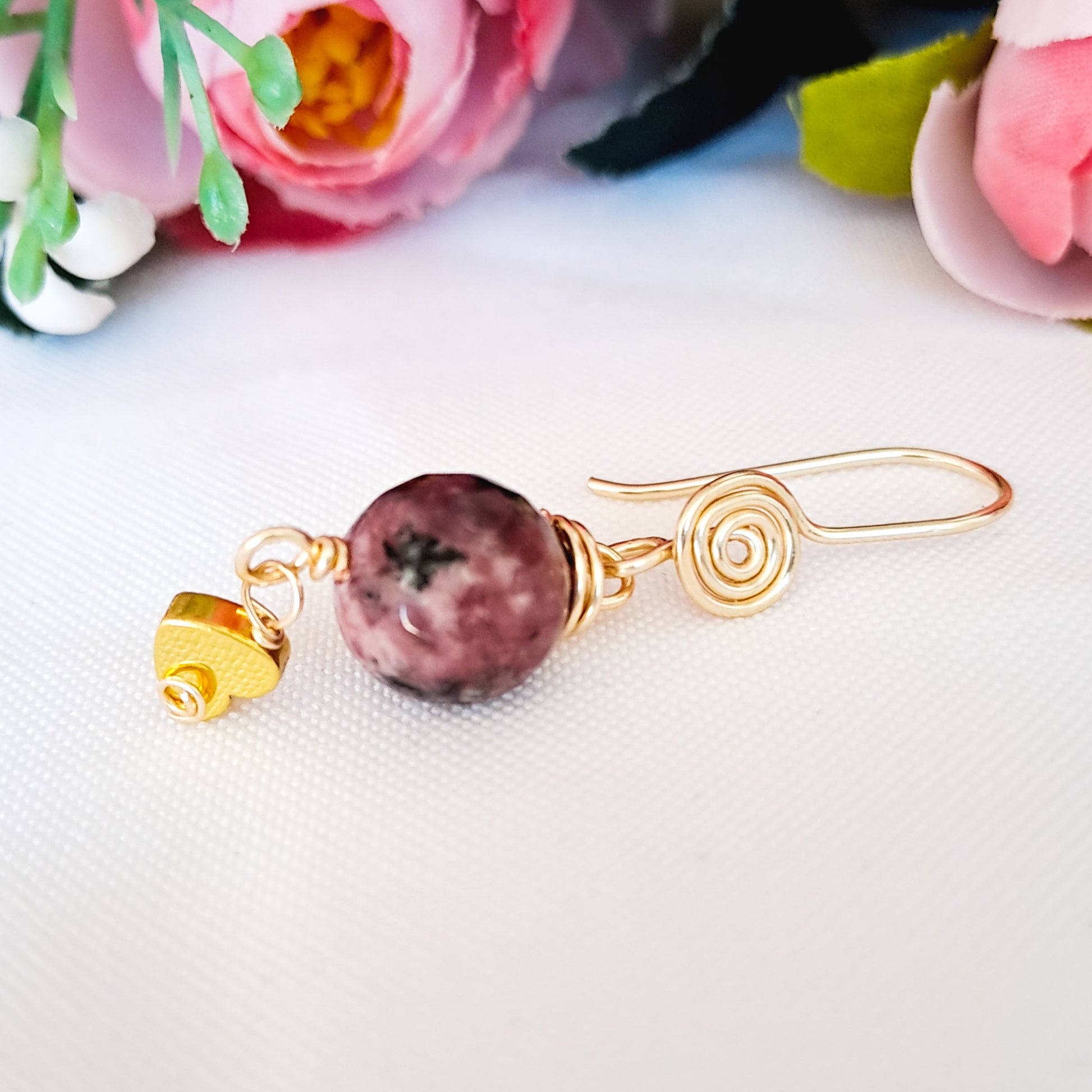 Aros colgantes con piedras ágatas matizadas y engarzadas, corazón de hematita pequeño colgando y anzuelo, todo bañado en oro.