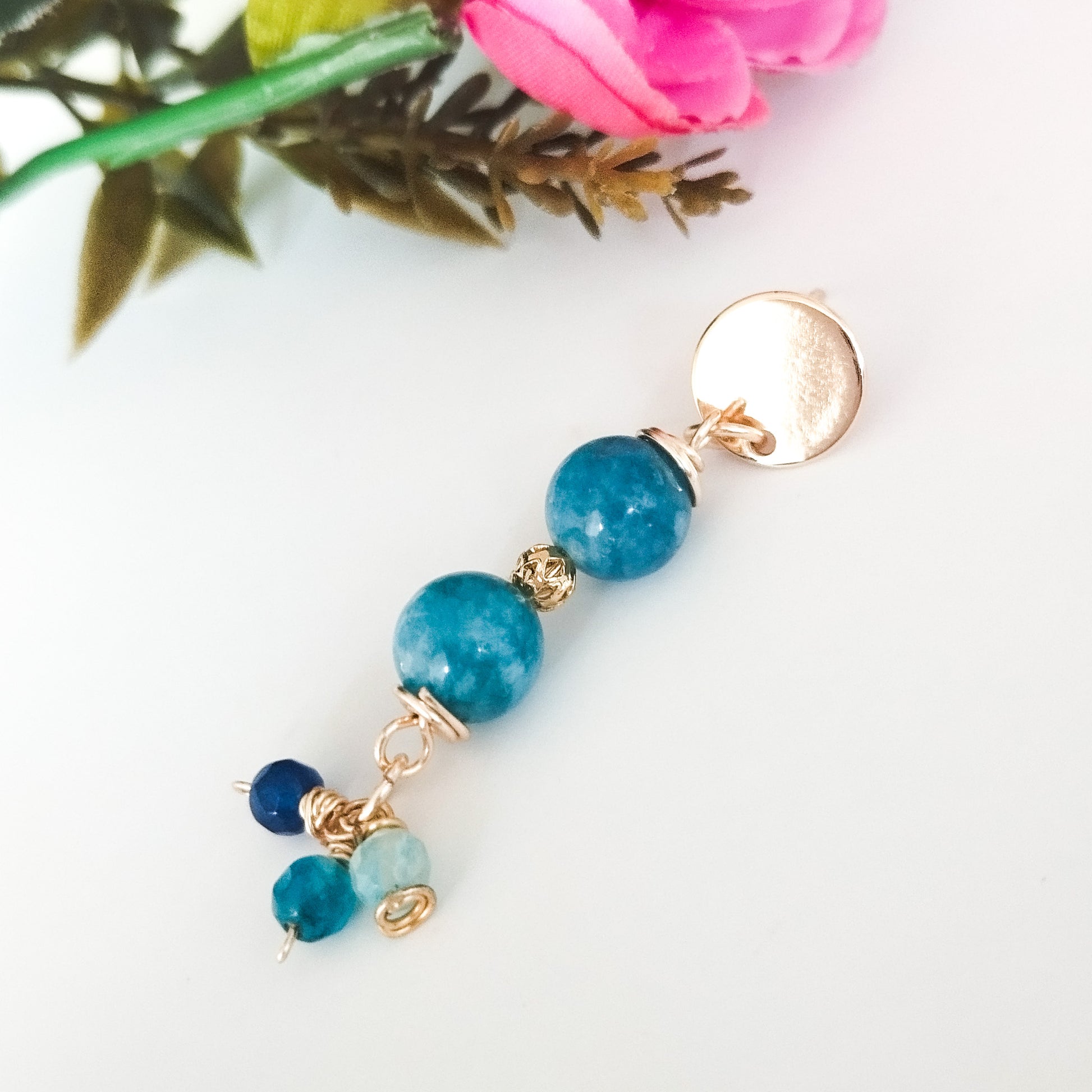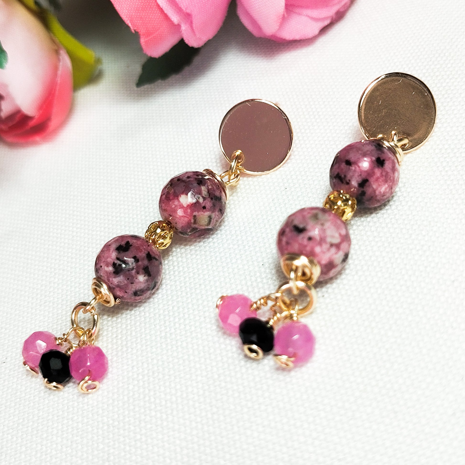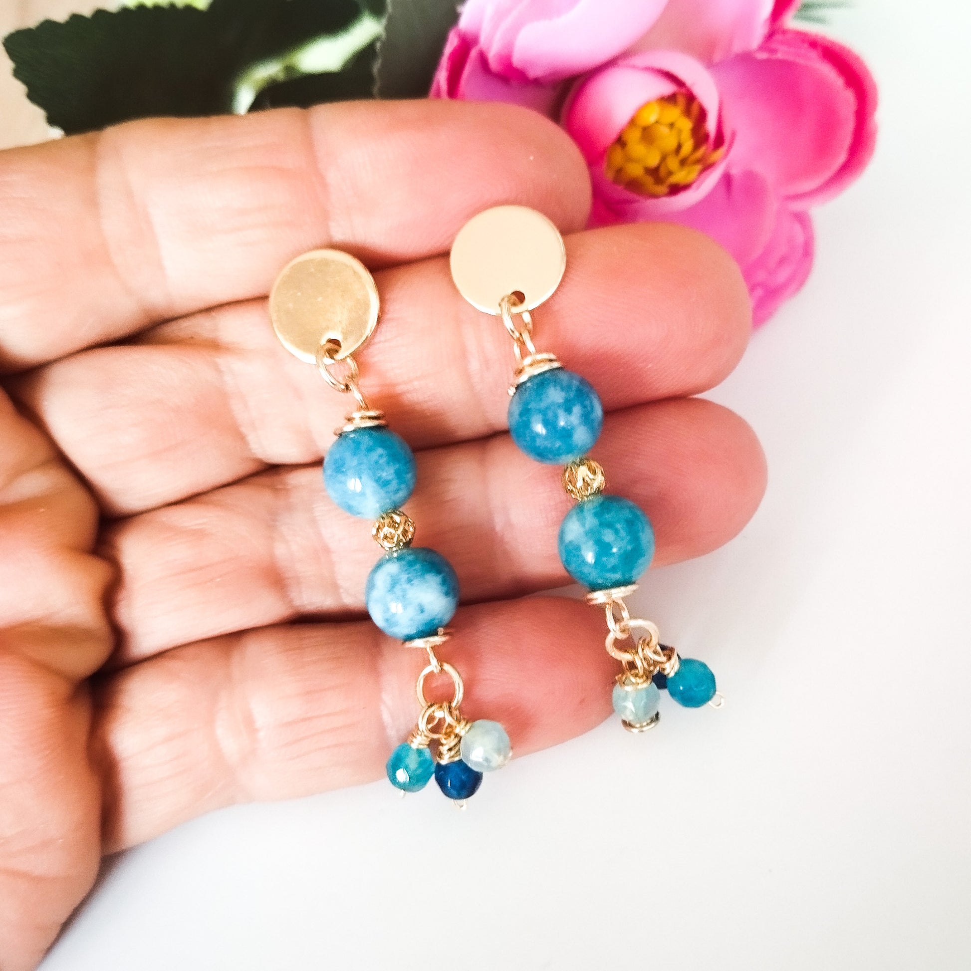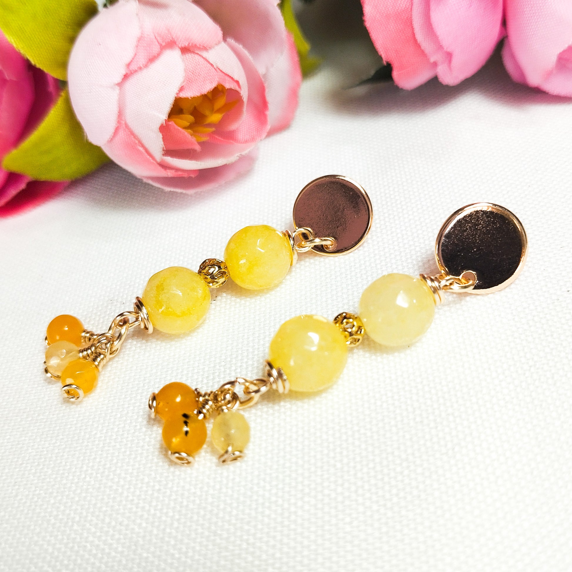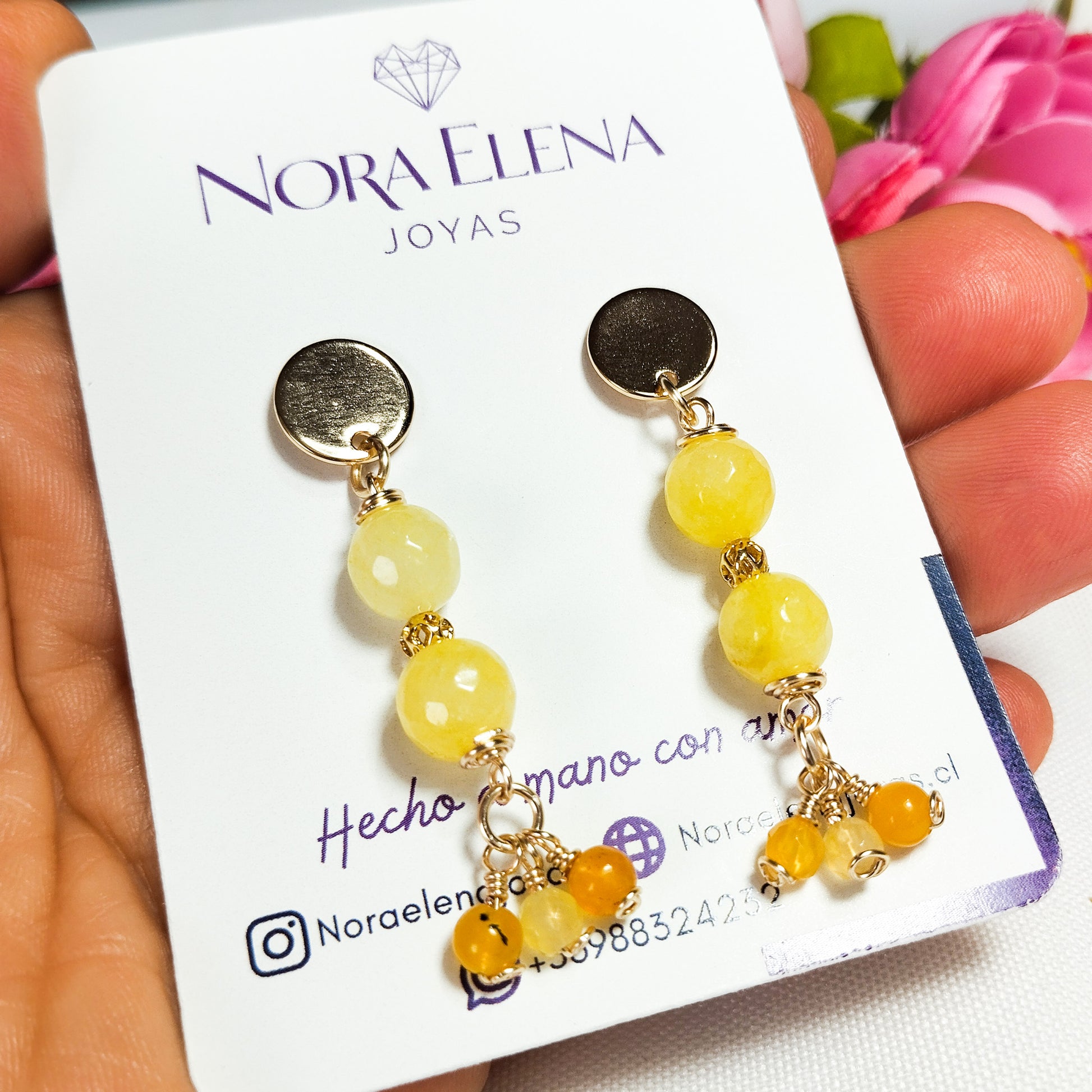 Aros Colgantes Largos Con Dos Piedras Ágatas Grandes, Piedras Pequeñas Colgando, y Base Redonda con Baño de Oro.
