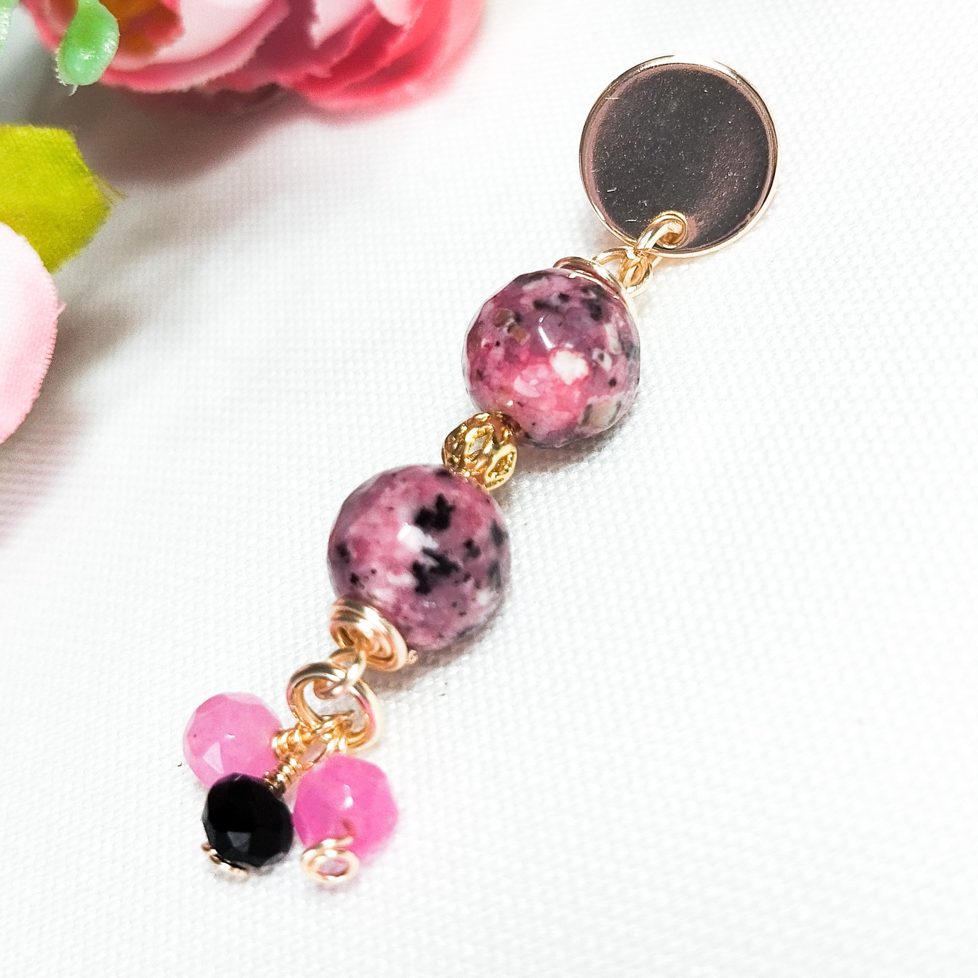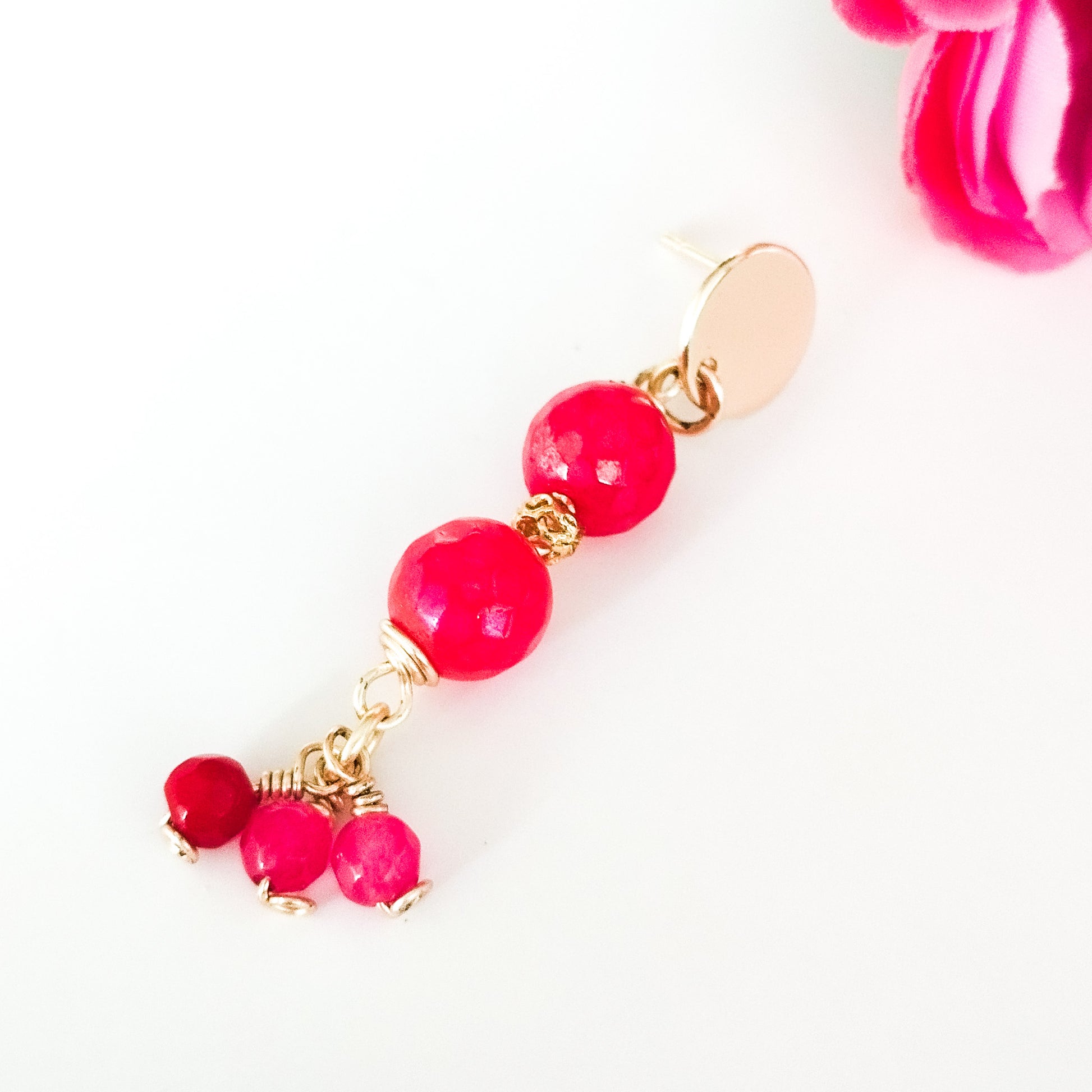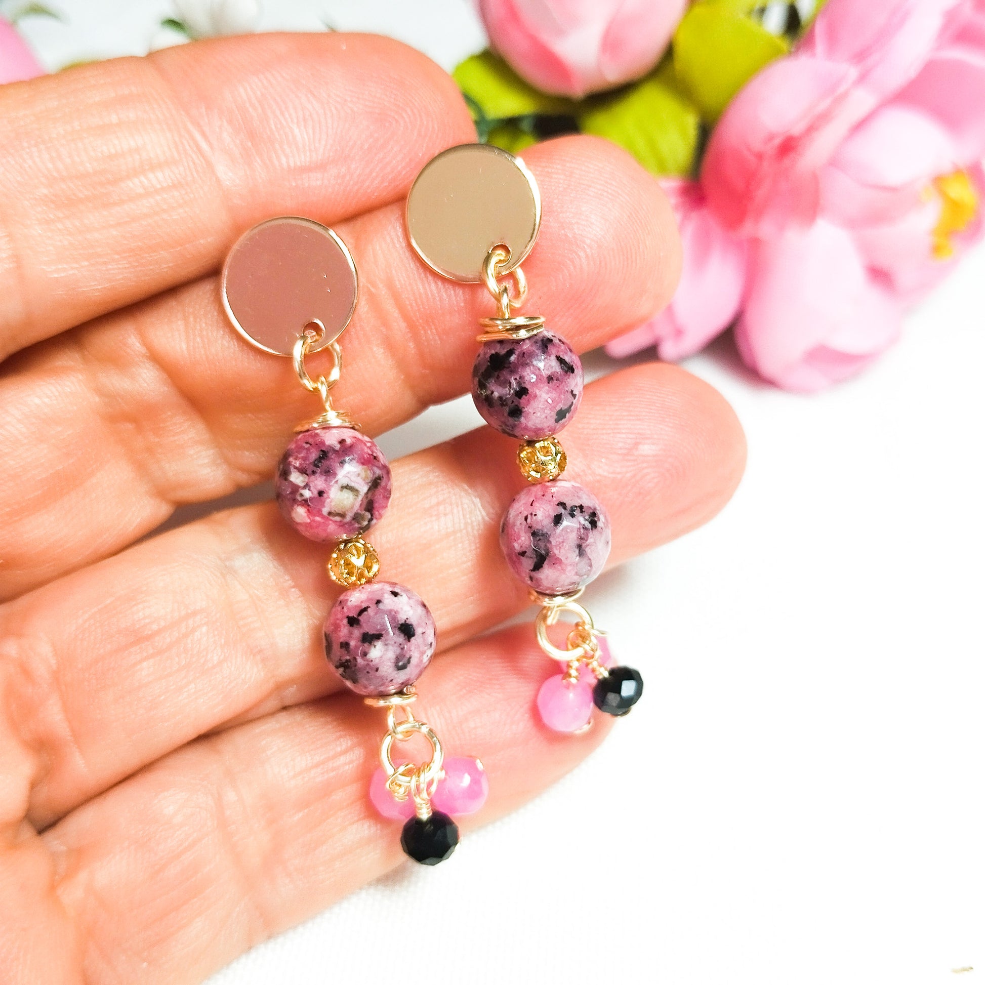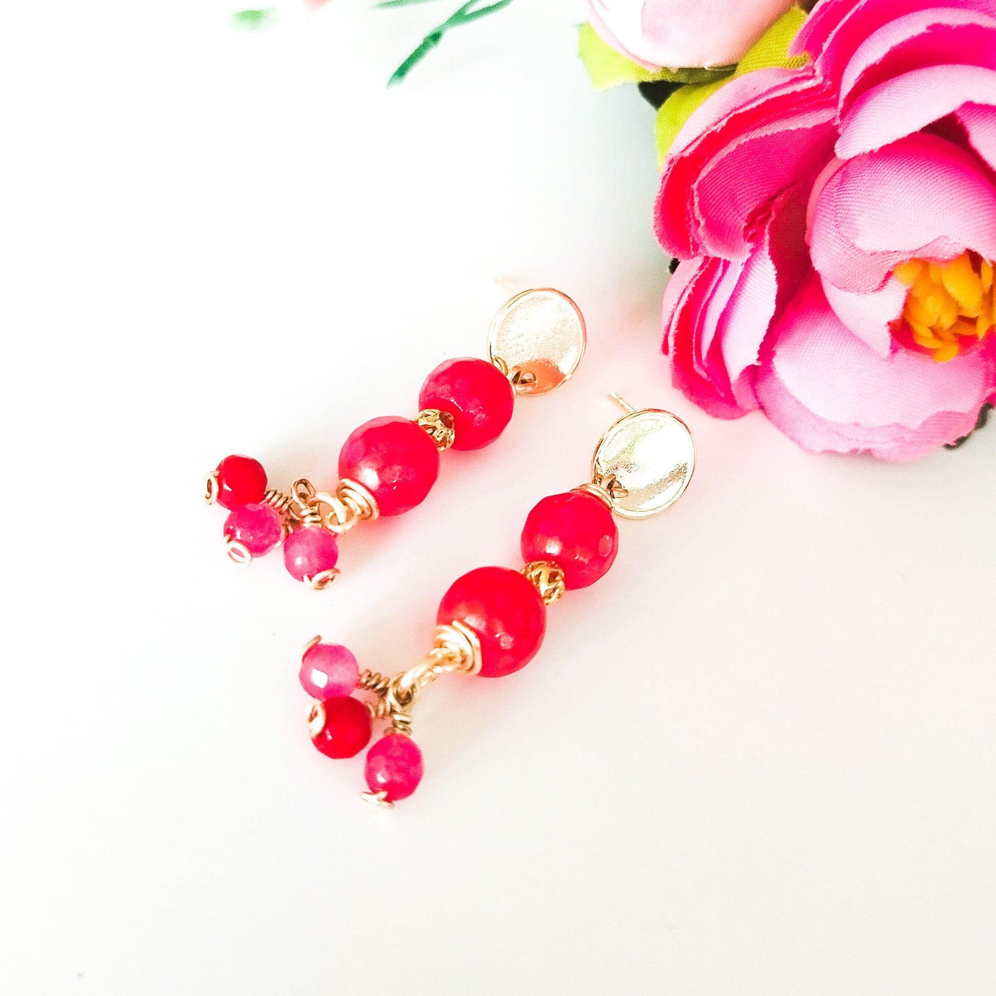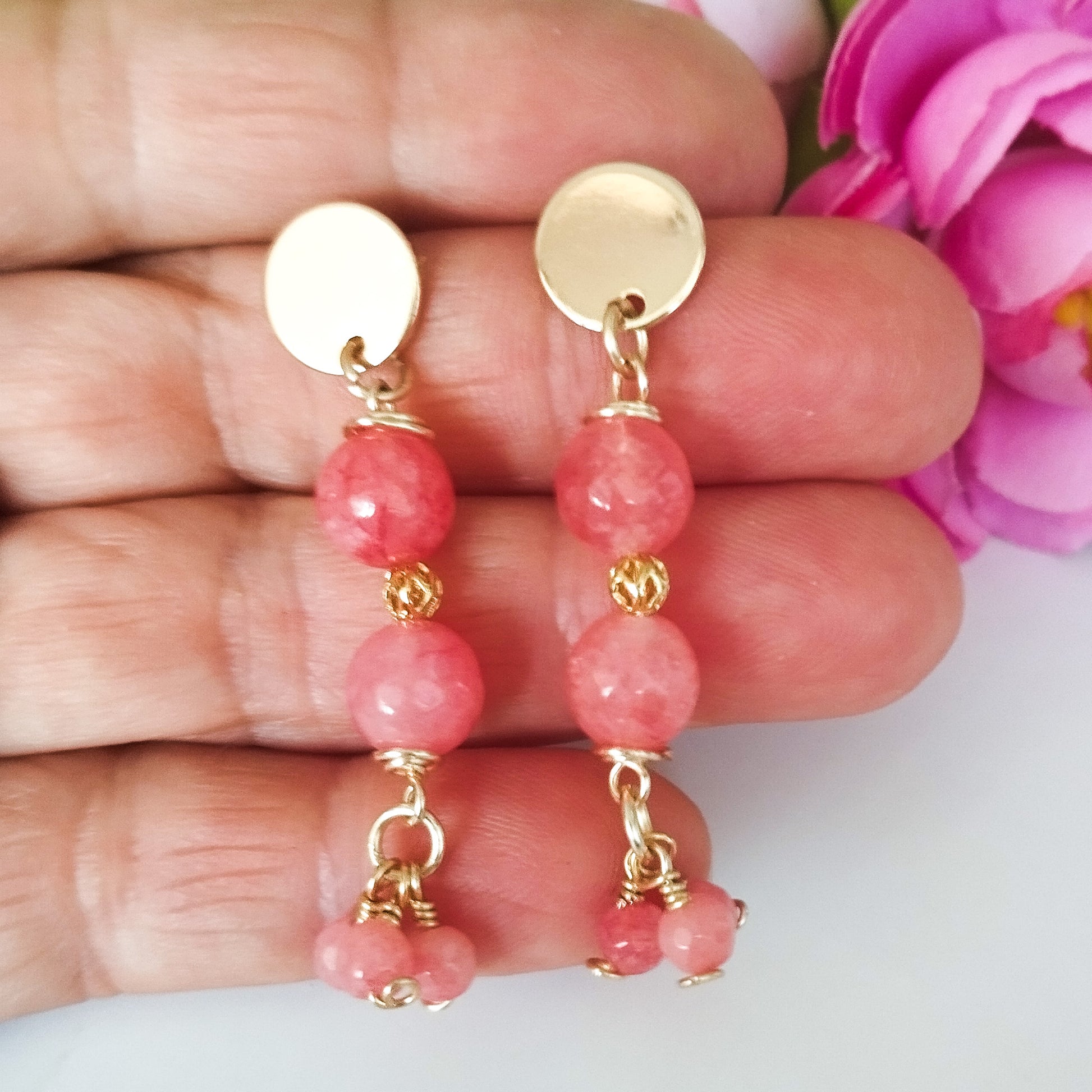 Aros Colgantes Largos Con Dos Piedras Ágatas Grandes, Piedras Pequeñas Colgando, y Base Redonda con Baño de Oro.