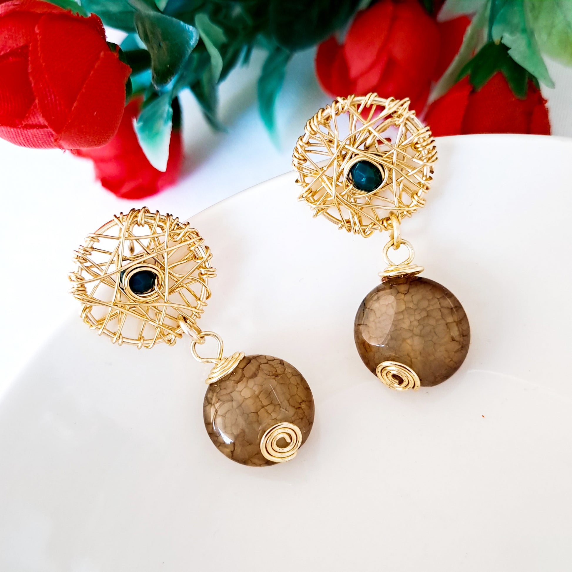 Aros Con Base Redonda Con Alambre Entramado Y Ágata Natural Colgante