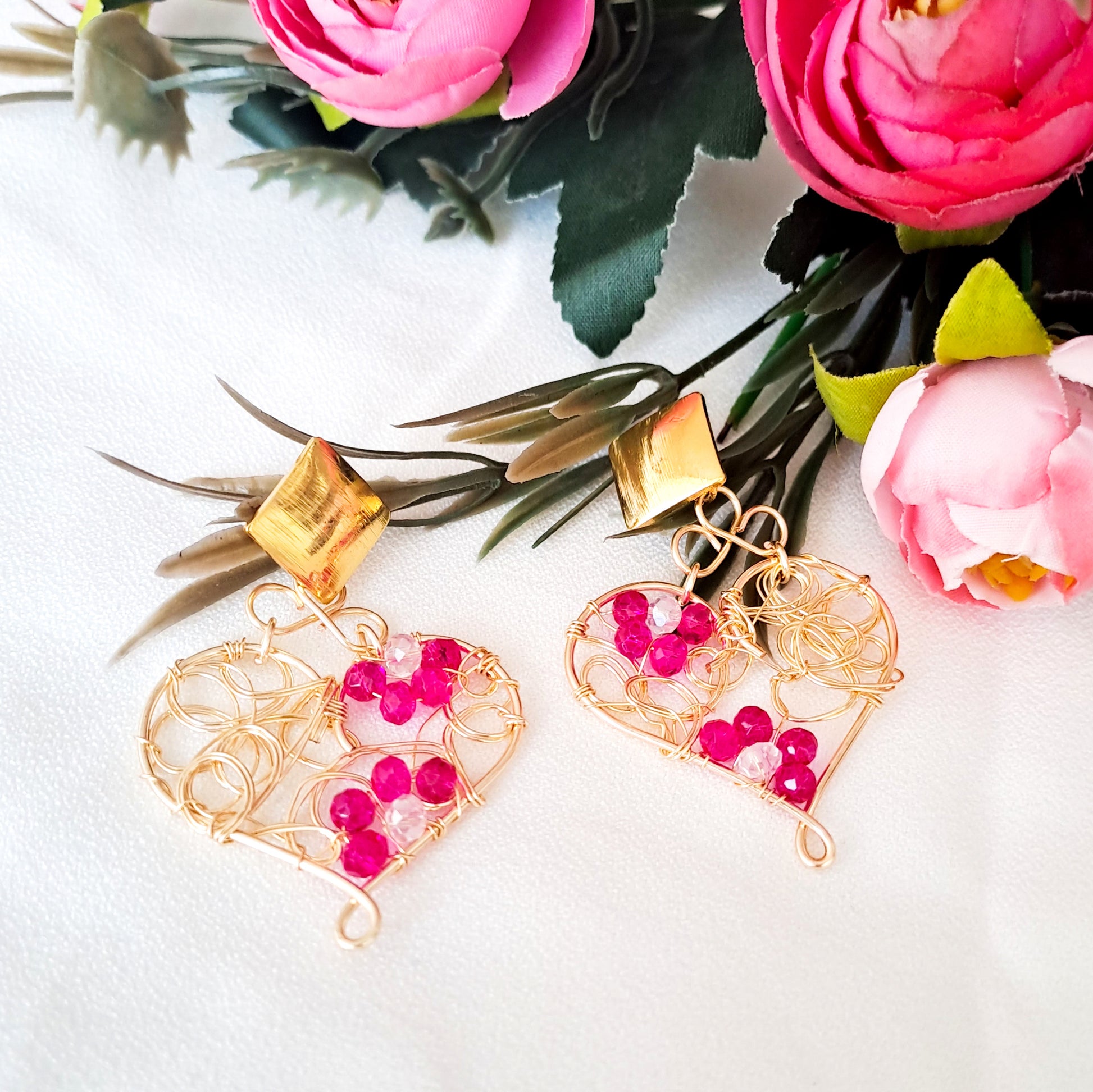 Aros en Forma de Corazón Con Arabescos de Cristales y Alambre