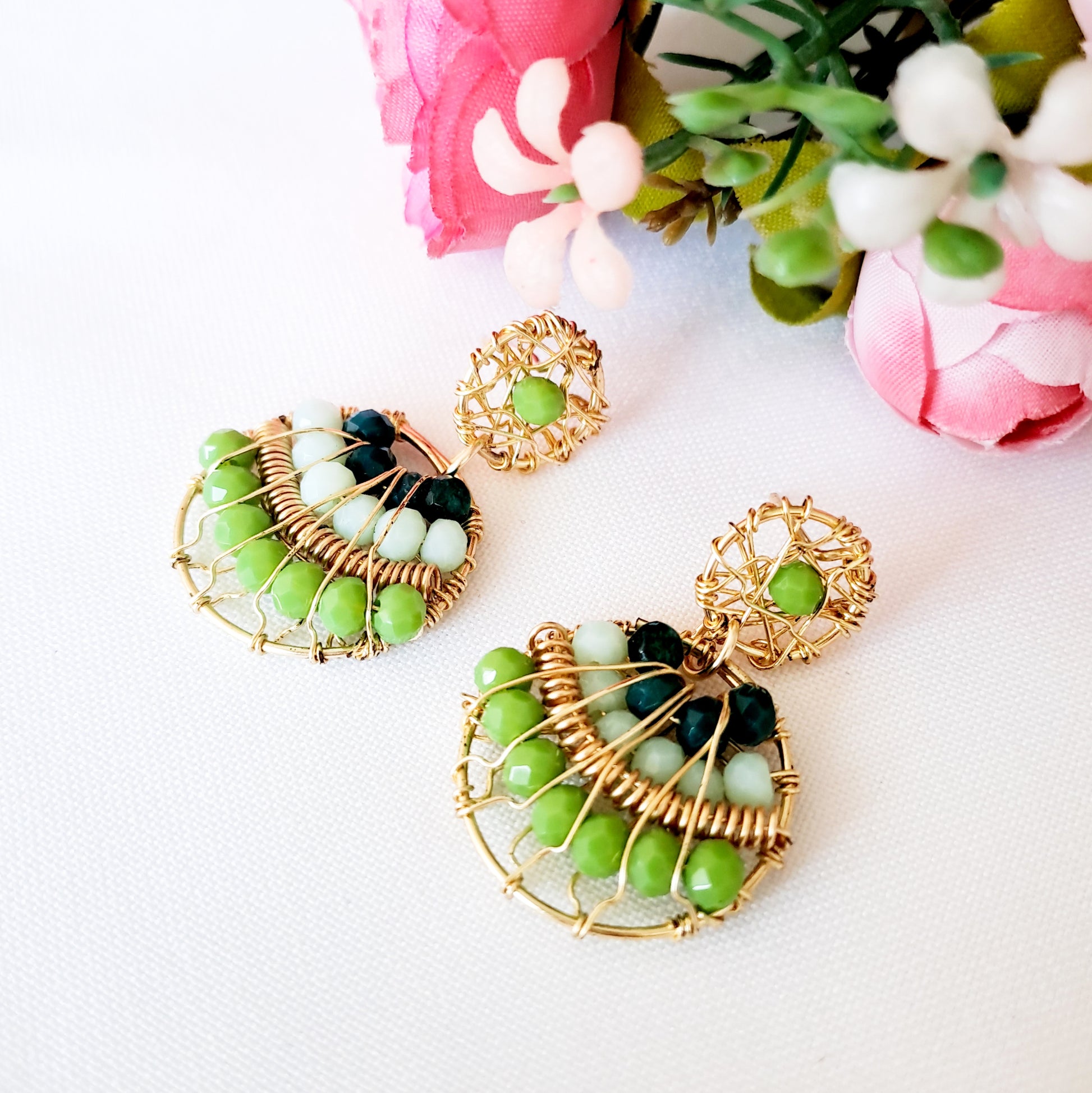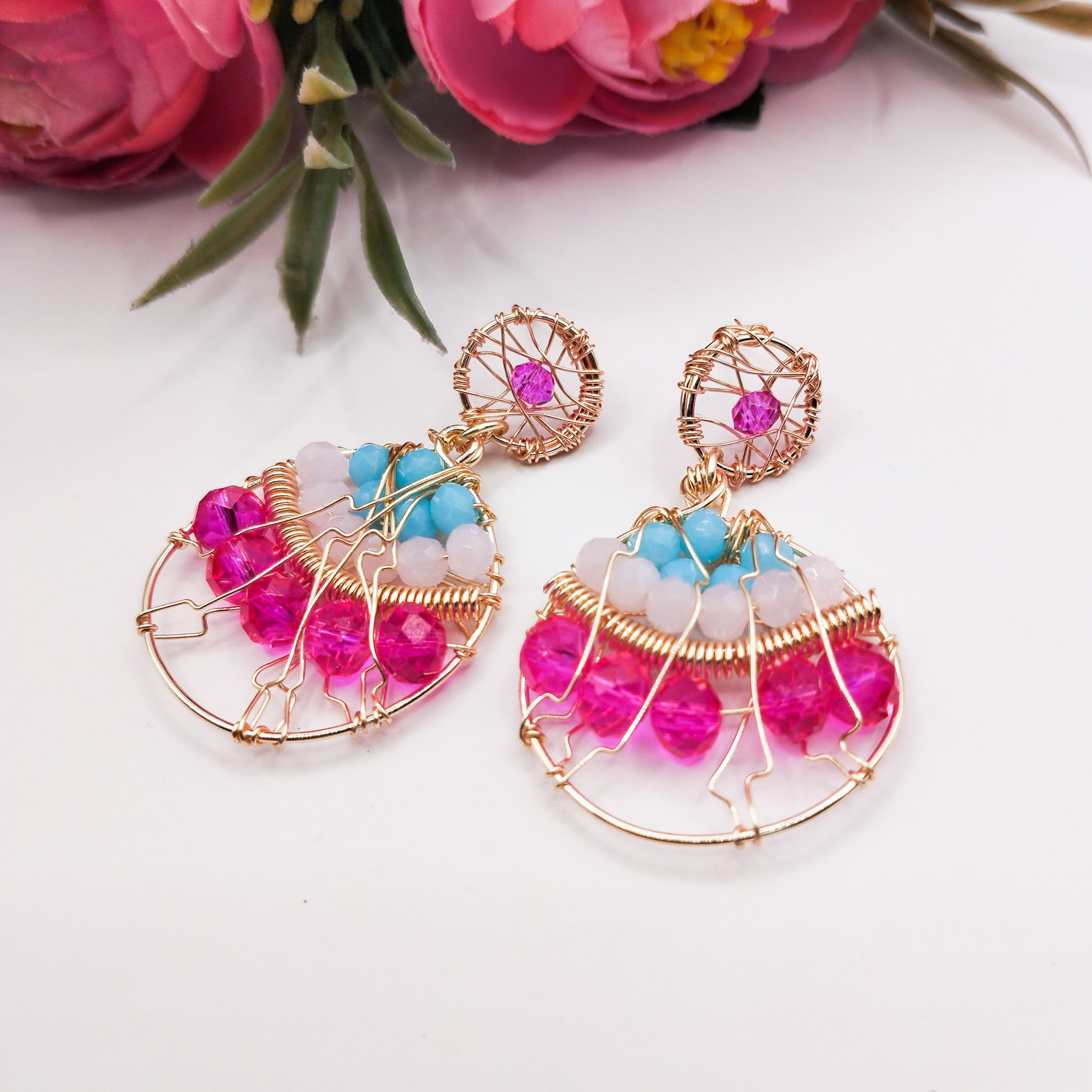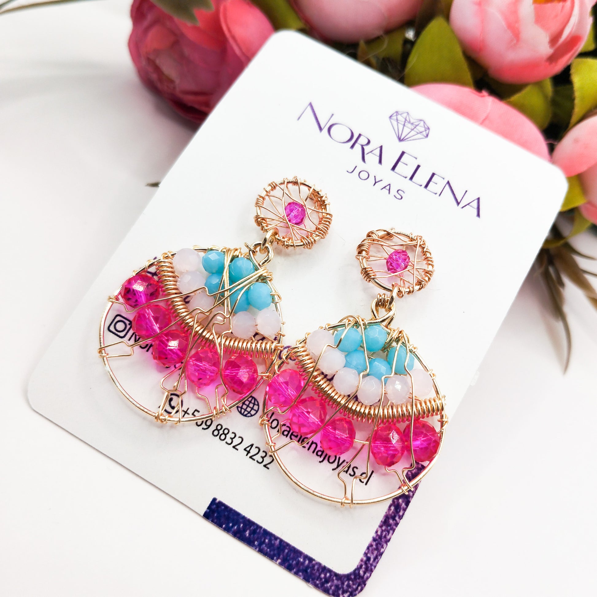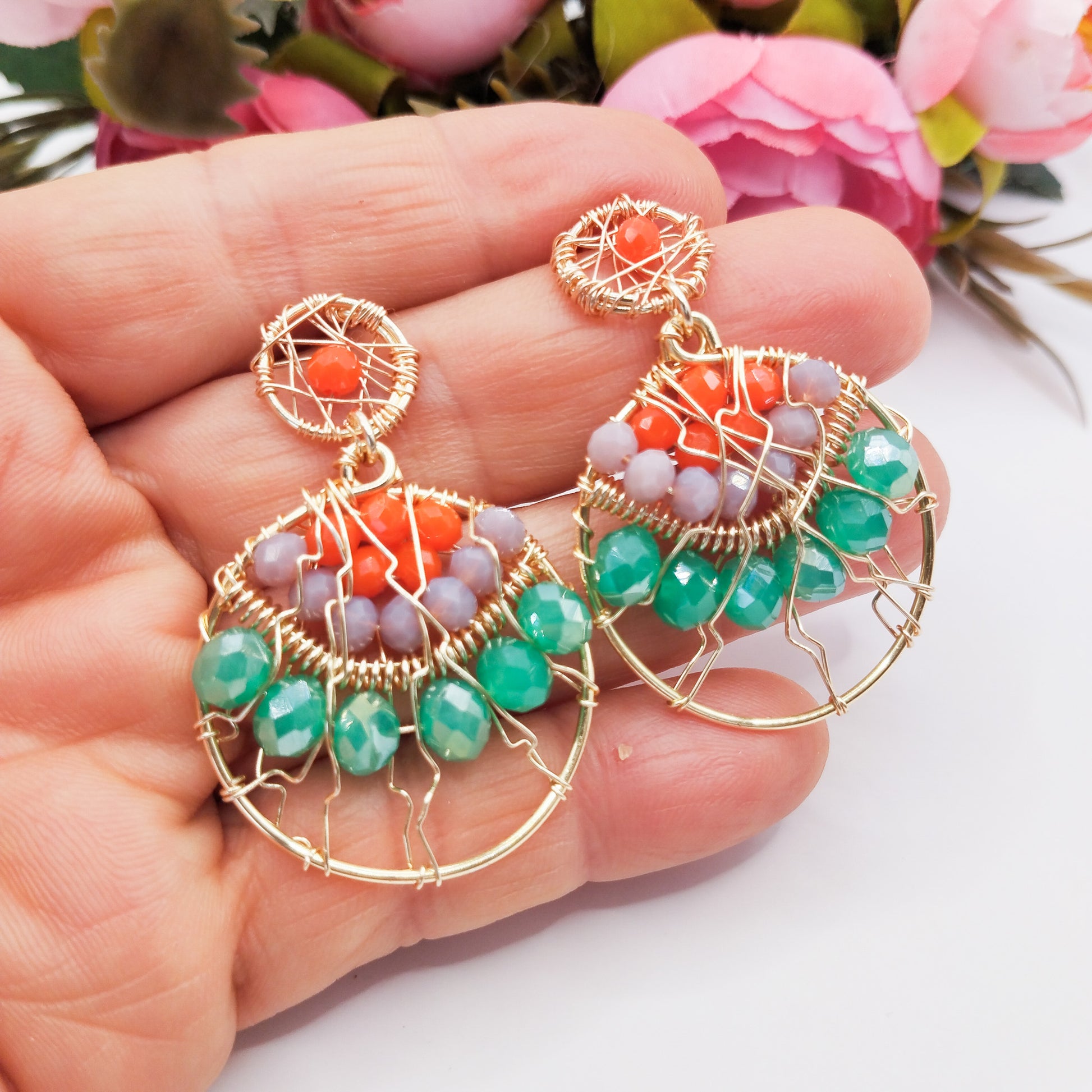 Aros Redondos Con Cristales Y Base Tejida en Alambre