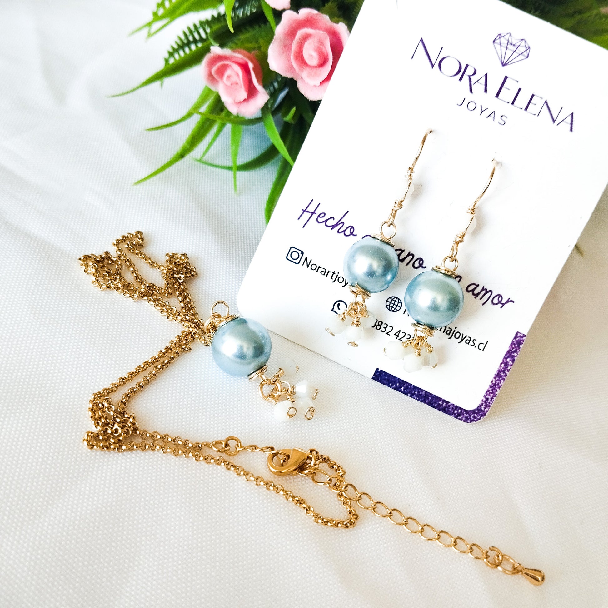 Conjunto de Collar y Aros Colgantes Con Perlas Shell Azules