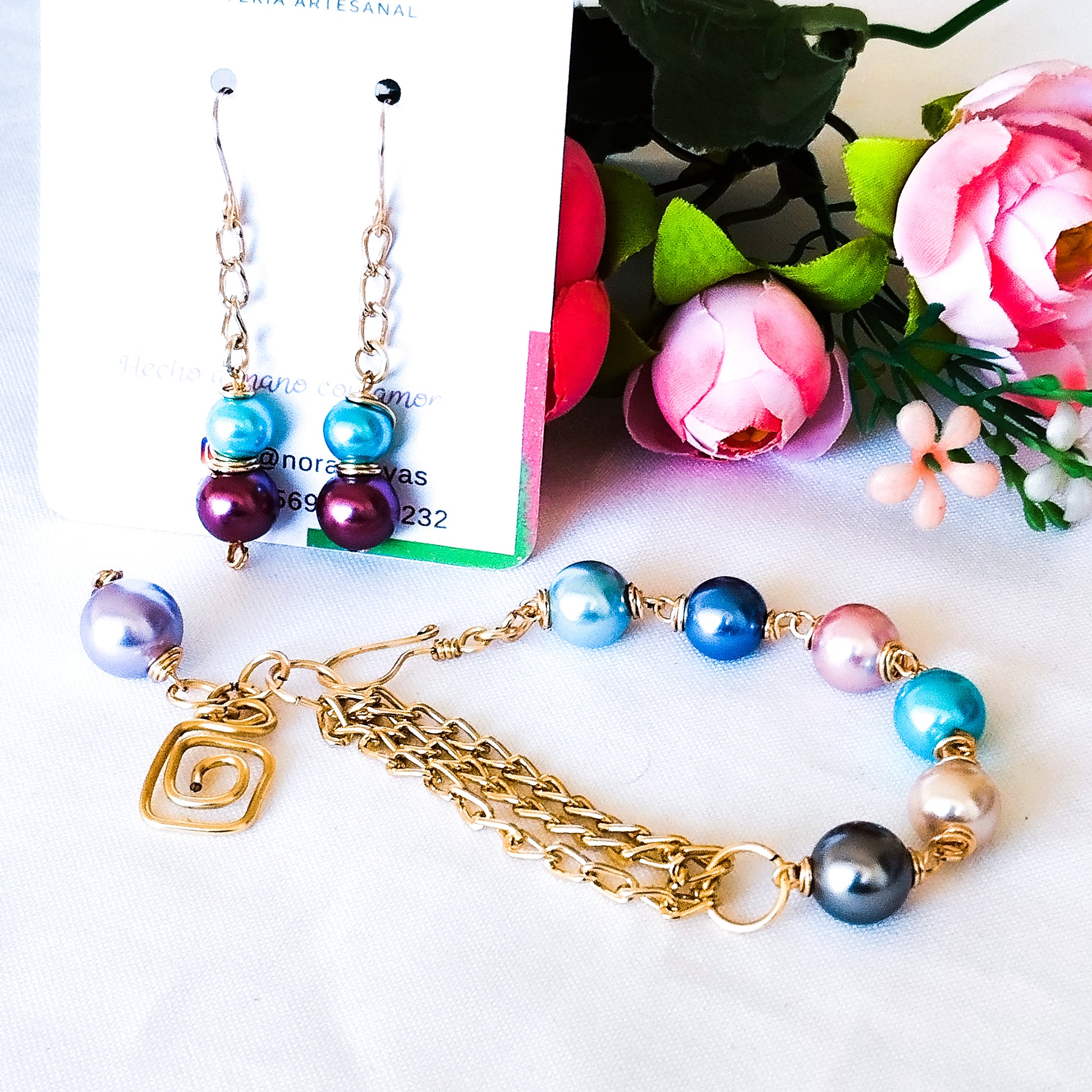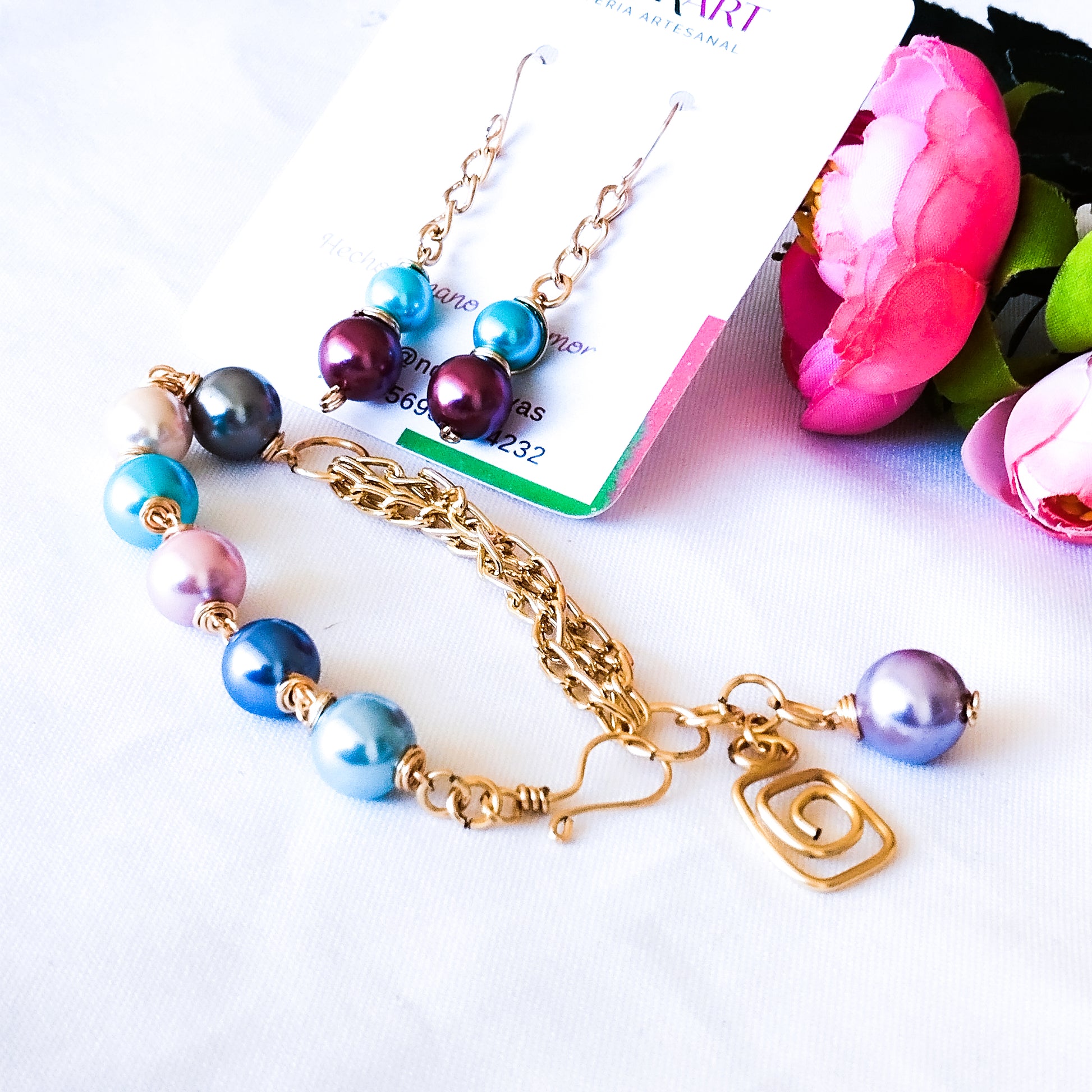 Conjunto de Pulsera Y Aros en Perlas Shell Y Cadena