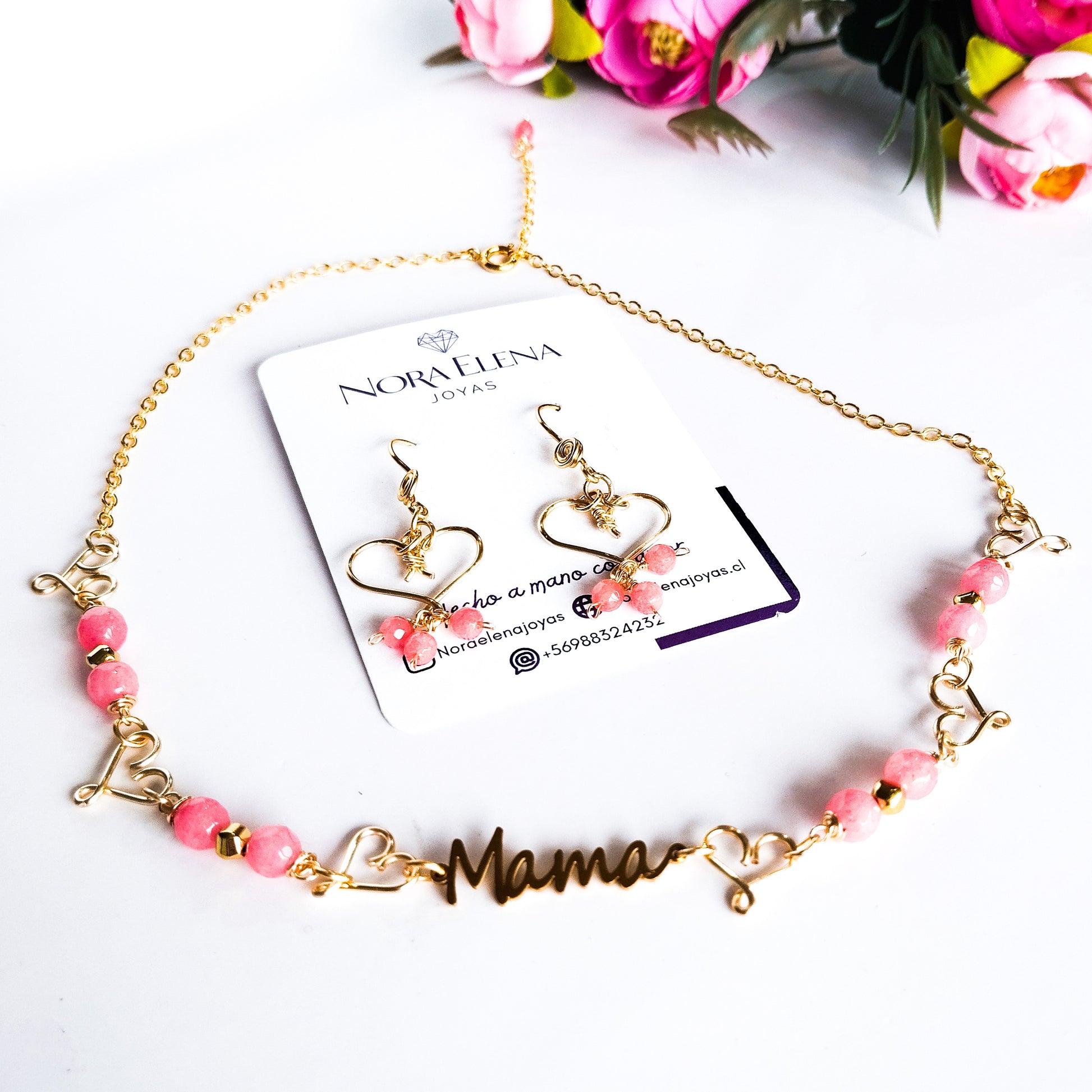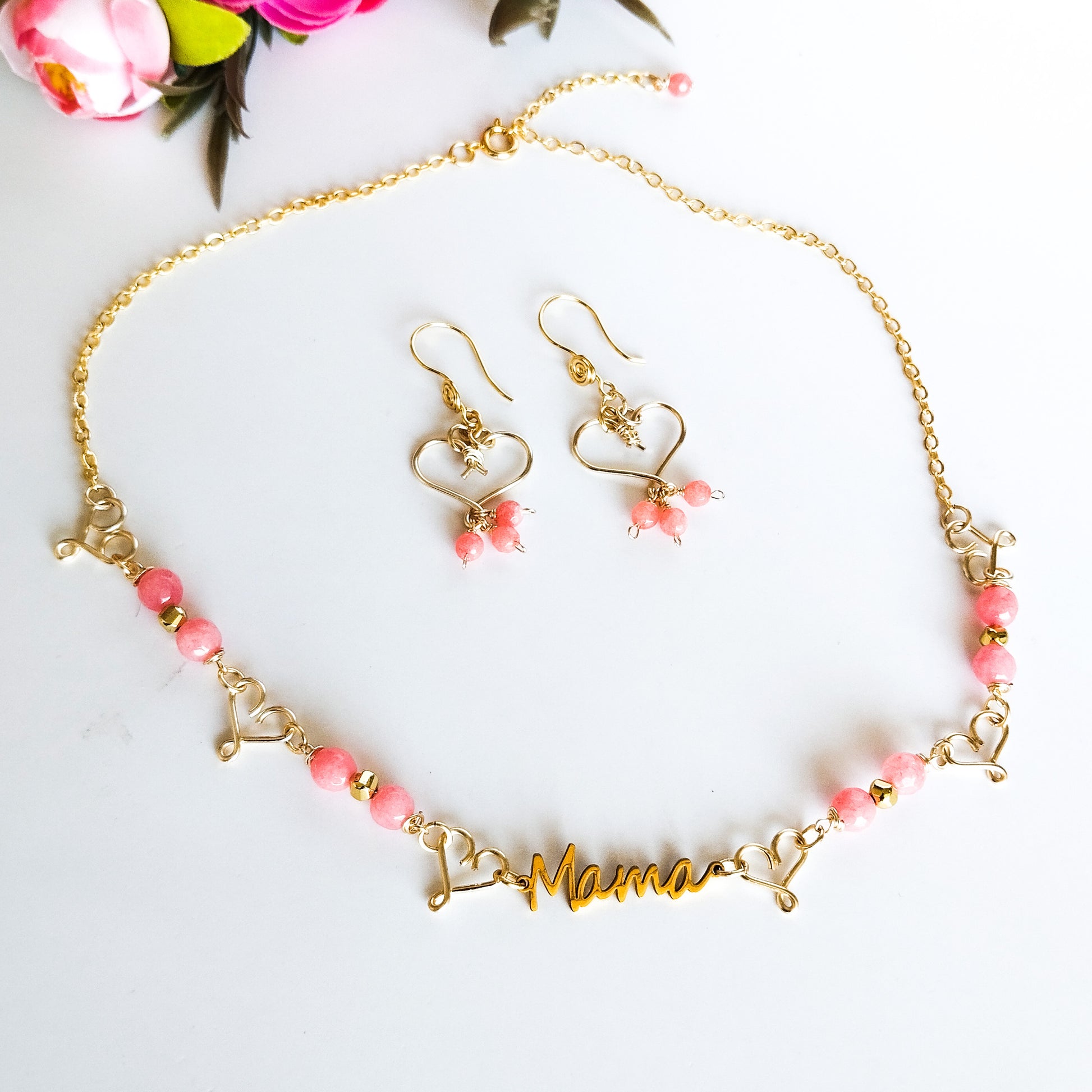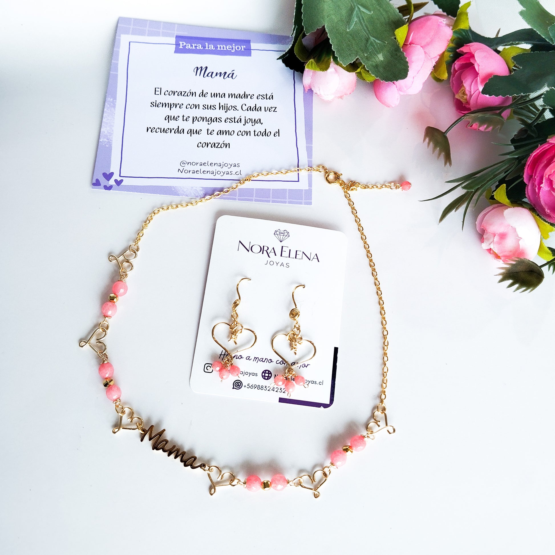 Juego de Collar y Aritos del Día de las Madres en Piedras Ágatas Y Separadores en Forma de Corazón.
