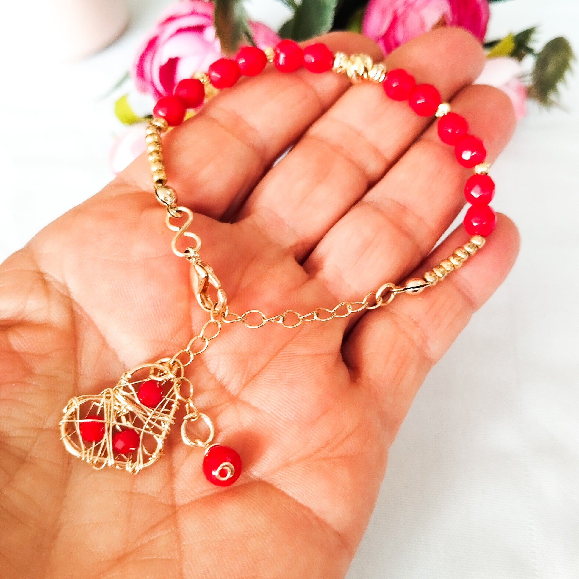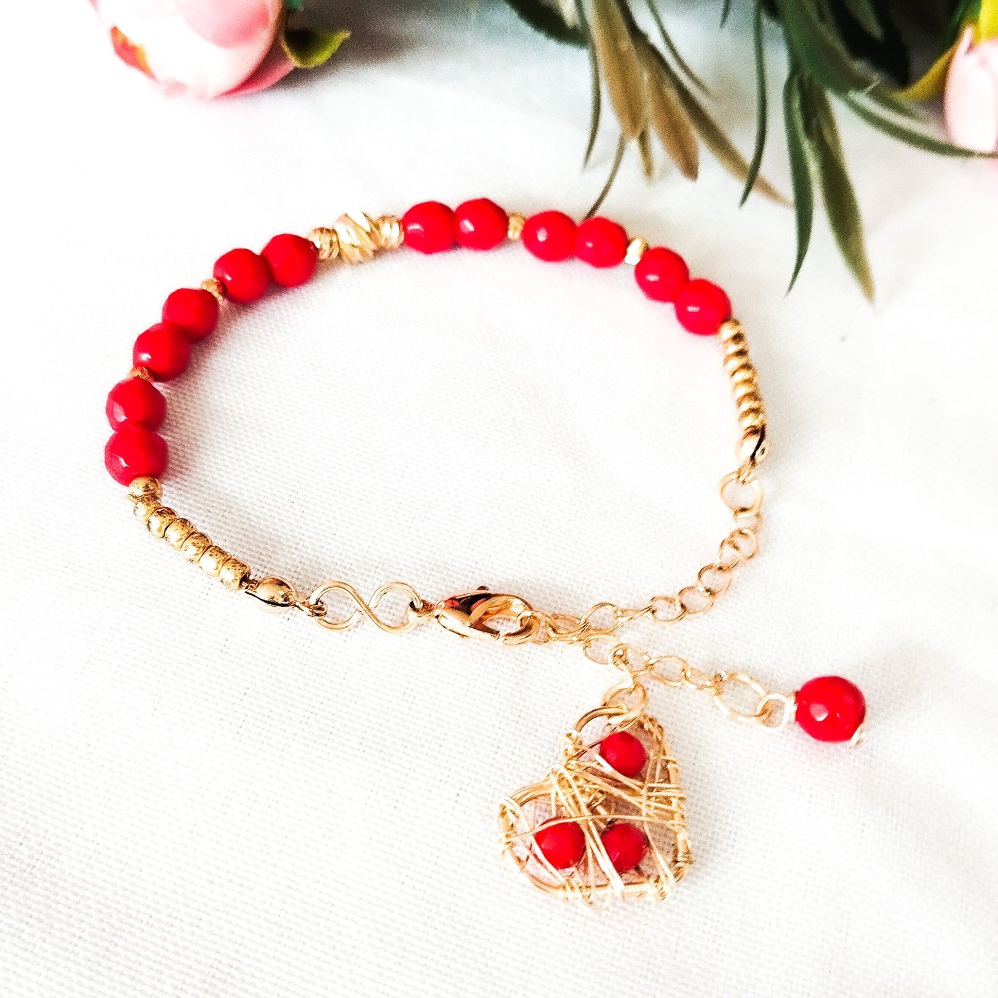 Pulsera en Ágatas con bolitas labradas, dije de corazón tejido con agatas y alambre y cadena extensora, todo con baño de oro.